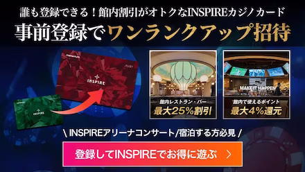『INSPIRE REWARDS』は、INSPIREエンターテイメントリゾート内の様々な特典が受けられる会員カードです。INSPIRE VIP CASINO CLUB経由で入会すると、通常よりワンランク上のステータスからスタートできる特別キャンペーンを実施中。