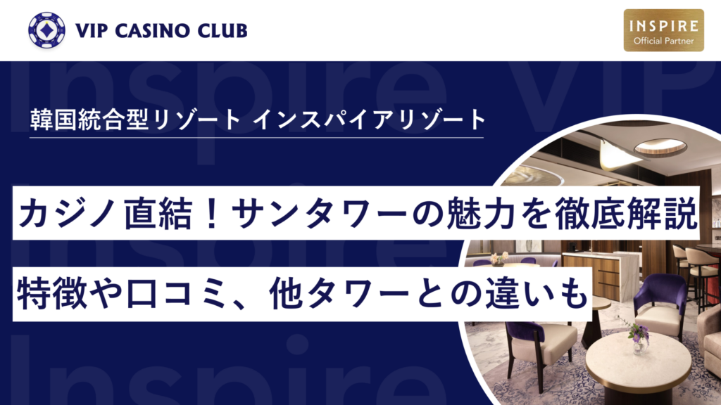 2024年に韓国・仁川にオープンした「インスパイアホテル」の3つのタワーの中で、カジノ愛好家に特に人気を集めているのが「サンタワー」です。太陽の輝きと活力をテーマにした赤と紫を基調とする豪華なデザインが特徴で、何より最大の魅力はカジノフロアの真上に位置するという絶好のロケーション。