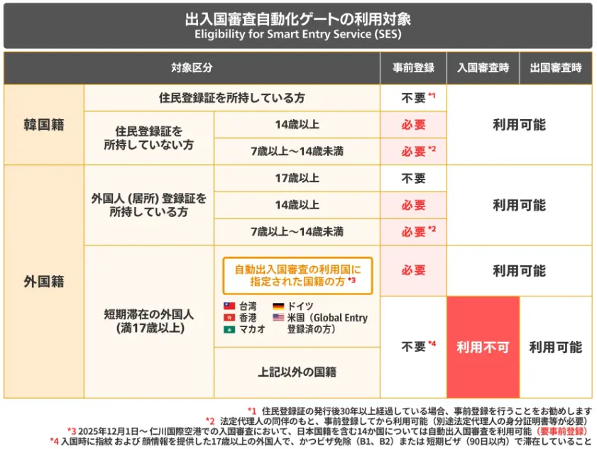 スマートエントリーサービス(SES)は、パスポート情報と生体認証(指紋・顔認証)を活用した自動出入国審査システムです。2025年12月1日から、日本を含む14カ国の旅行者が利用できるようになりました。