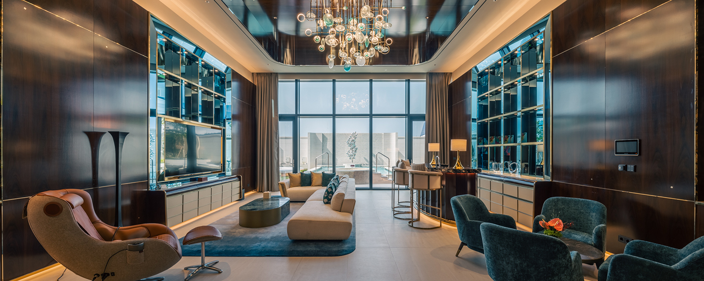 ヴィラの室内には、専用のミーティングルーム(応接室)、マッサージルーム、プライベートスパ(サウナ)など、贅を尽くした施設が完備されています。調度品やインテリアはすべて最高級素材で統一され、大理石張りのバスルームや最新式のジャグジーバス、大型8K対応壁掛けテレビ、プレミアムオーディオシステムなど、最先端の設備が整っています。