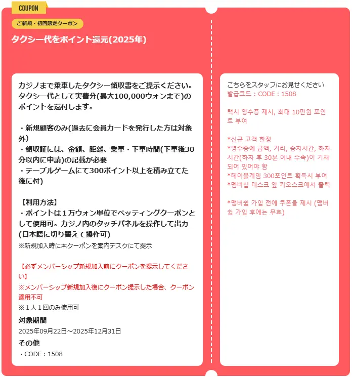利用方法は簡単で、タクシーを降りる際に運転手から領収書を受け取り、カジノの受付で提示するだけ。最大100,000ウォンがポイントで還元されるため、仁川国際空港からのタクシー代をカバーできます。