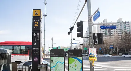 まず、クァンナル駅の乗り場へは、改札を出て2番出口から地上に向かいます。目の前にある横断歩道を渡ったすぐ先に、専用のバス停が見つかります。