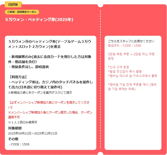 50,000ウォン分ベッティングクーポンテーブルゲーム用30,000ウォン+スロット用20,000ウォンを進呈新規会員登録時にクーポン提示一人一回限り。他クーポンとの併用不可初回来場者