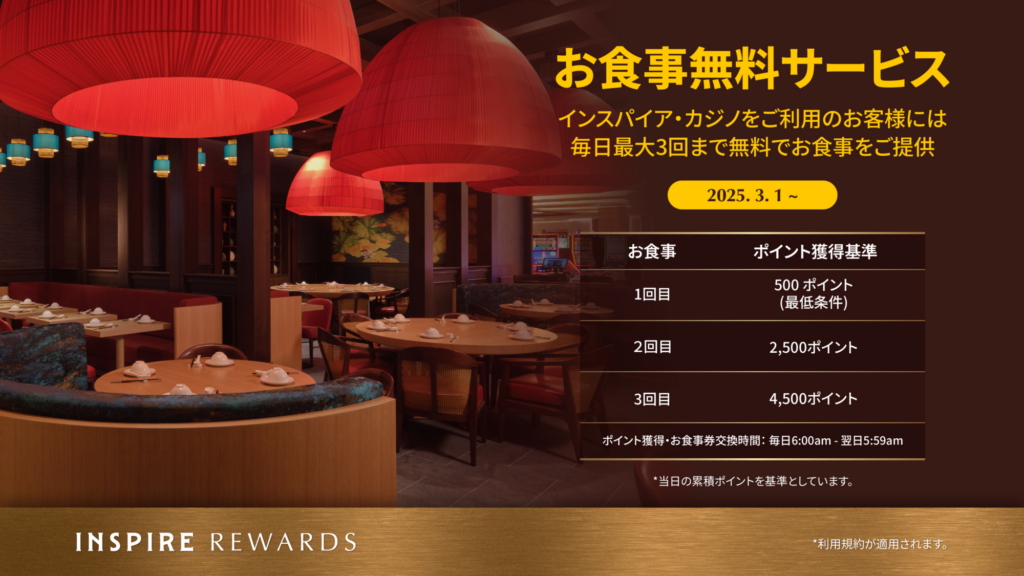 インスパイア・カジノをご利用のお客様は、毎日最大3回までお食事をお楽しみいただけます。500ポイントを獲得すると最初のお食事を、次のお食事は追加2,000ポイント獲得時に、ポイント差引なしで追加で食事券をお受け取りいただけます。