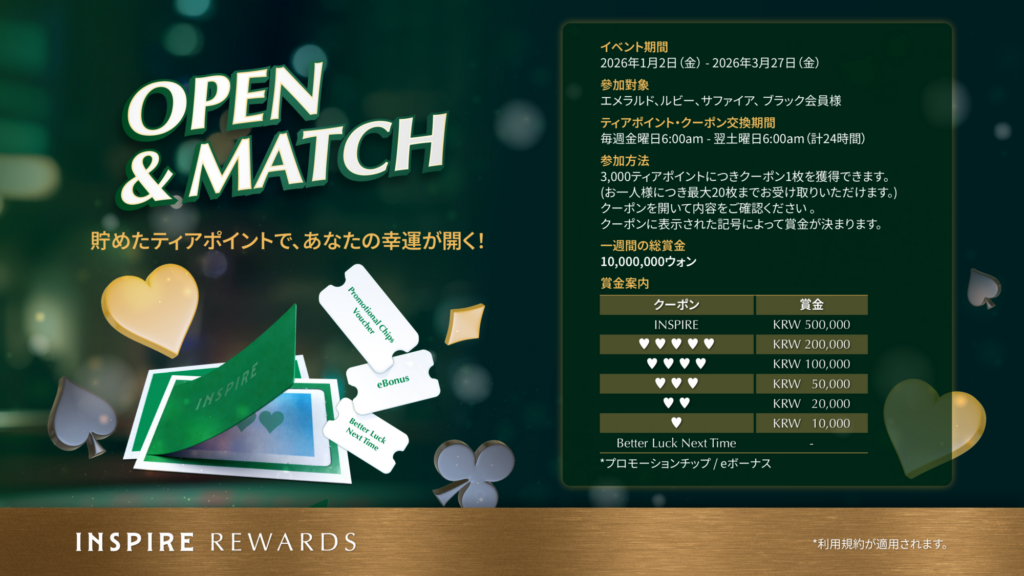 本キャンペーンは「INSPIREカジノ初来訪者」のお客様に加えて、GO TO INSPIREキャンペーンをご利用されたことのある「カジノクラブ会員」の方もご参加いただけます。
