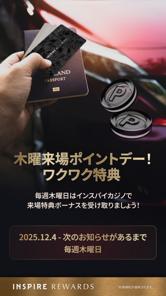 毎週木曜日にインスパイカジノでポイントを貯めると、来場特典ボーナスを受け取ることができます。