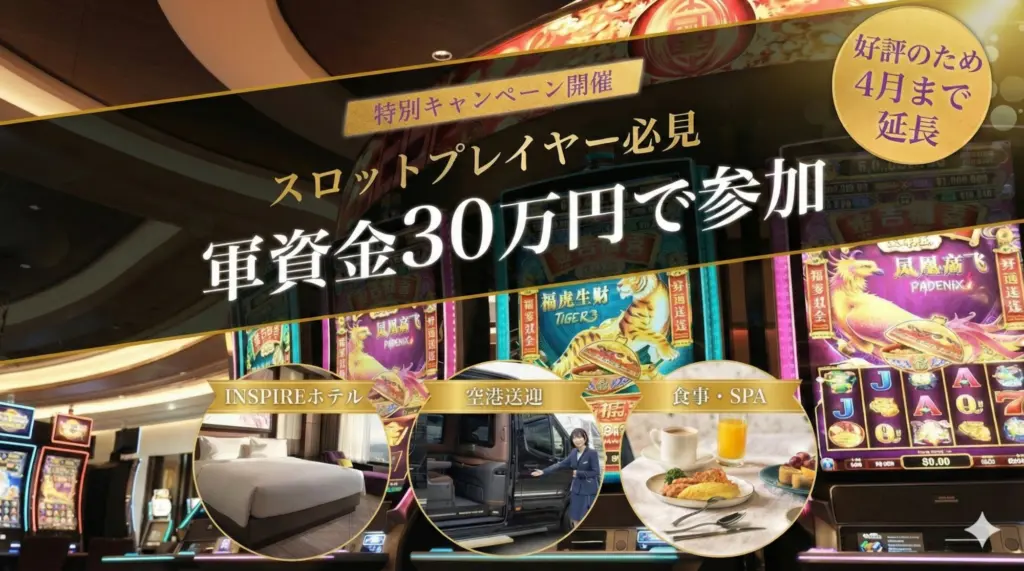 【2026年4月まで】軍資金30万円で参加!スロット・ETGプレイで無料宿泊